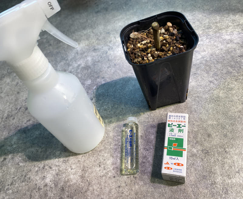 この記事はこんな方におすすめ! 実生株の徒長を抑えたい方 脇芽を増やして株姿を整えたい方 植物ホルモン剤の使用に興味がある方 昨年末に播種した(実生5〜7ヶ月)、ブルセラ・ミクロフィラ Bursera microphylla↓コミフォラ・クラウセリアナ Commiphora kraeuseliana ↓この子達は選びに選びぬかれた超特選の 徒長株 ですww育成環境はざっくりこんな感じ↓↓温度湿度秋〜冬25〜34°50〜65%春〜夏33〜37度50〜65%室内温室環境CODEXGREEN -コーデックス/塊根植物、多肉植物の育成日記【室内温室DIY ver.5】「湿度の自動制御」&「近距離LED照射」で植物の”徒長”を抑...室内温室DIYシリーズの第5弾。スマートホーム機器を導入し湿度を自動制御したり、近距離から育成LEDを照射するなど「徒長」対策を施しました。CODEXGREEN -コーデックス/塊根植物、多肉植物の育成日記室内温室で始める「夏型コーデックスの冬播種/2018W」室内温室で「冬」播種に挑戦!コミフォラ、ブルセラ、パキポディウムなど、夏型コーデックスの種子150粒を播きました。ヒョロ長い株達がさらに上に伸びないように(頂芽抑制)、側芽(腋芽)促進 効果のある「ビーエー液剤(BA液剤)」の散布を試験しました。ビーエー液剤 10ml(園芸用品 農業資材 家庭菜園 農業用品 園芸 農業 資材 ガーデニング用品 ガーデニング …940円(11/16 22:19時点)楽天市場目次1 ビーエー液剤(BA液剤)とは1.1 主な効能1.2 ご使用における注意事項(抜粋)2 植物ホルモン「サイトカイニン」「オーキシン」の作用3 ビーエー液剤を散布する3.1 ①剪定3.2 ②ビーエー液剤を希釈3.3 ③散布4 散布から一週間後4.1 ブルセラ・ミクロフィラ4.2 コミフォラ・クラウセリアナ5 まとめ5.1 Related Postsビーエー液剤(BA液剤)とは植物ホルモンの一種であるサイトカイニンと類似の作用を示すベンジルアミノプリンを主成分とする植物成長調整剤です。クミアイ化学工業株式会社主な効能側芽促進、着花促進(温州みかん)、副梢発生促進 などご使用における注意事項(抜粋)調製した薬液は当日に使い切ったほうがよい。噴霧する際はマスクや防護メガネをしたほうがよい。 など植物ホルモン「サイトカイニン」「オーキシン」の作用wikipediaより引用「サイトカイニン」は側芽の成長を促進し、多くは根で合成されます。対する「オーキシン」は、頂芽で合成され、側芽の成長を抑止します。詳しくは以下リンクをご参照ください。「頂芽優勢の仕組」(日本植物生理学会|みんなのひろば)「頂芽優勢におけるオーキシンとサイトカイニンの関係について」(日本植物生理学会|みんなのひろば)ビーエー液剤を散布する①剪定徒長が激しいものは主幹から強剪定し、切り口に癒合剤をペースト。癒合剤は先日紹介したケアヘルス オー↓TAURUS(トーラス) ケアヘルス-O 50G569円(11/16 22:14時点)Amazon楽天市場YahooAmazonの情報を掲載していますCODEXGREEN -コーデックス/塊根植物、多肉植物の育成日記オペルクリカリア・パキプスの"カルス形成"に見る癒合剤の重要性オペルクリカリア・パキプスの枝の剪定切口に癒合剤を塗布して、カルス形成〜萌芽に至るまでを観測しました。つまり頂芽を剪定してオーキシン濃度を下げるのが狙いついでに挿し木もチャレンジ↓②ビーエー液剤を希釈BA取説の希釈率を見ると、りんごの苗木で50〜100倍、カーネーションで300倍、アスパラガスで300〜600倍、きくで2000〜4000倍、云々。実生5〜7ヶ月目のコミフォラ、ブルセラの主幹の固さは「りんご〜カーネーション」ぐらいと想定し、100倍の希釈水 を作成する。水50mlに対し、液剤0.5mlで100倍の希釈率。0.5mlは約7〜8滴くらいか。液剤ボトル側面には1mlごとにメモリがあるのでわかりやすい。③散布「主幹」のみに絞ってスプレーしました。枯れるリスクを踏まえると植物全体に噴霧する勇気はなく、何しろ根拠のない希釈率でしたので、、遠慮気味に(汗)。疑似サイトカイニン(ベンジルアミノプリン)効果で脇芽促進が狙いプロの方は、葉先のみに散布したり、全体に散布したり、複数回に渡って散布したりと植種や成育時期によって使い分けるようです散布から一週間後早くもBA効果が出てきました!ぬぉぉぉ〜〜! ブルセラ・ミクロフィラ脇芽がたくさん!全くと言っていいほど側芽の気配がなかったので正直驚きです。 コミフォラ・クラウセリアナ元々側芽が出ているものもあったのですが、さらに拍車が掛かったようです。本来、BAの効果測定には最低2週間は見守る必要があるようです(※植種、時期によっても異なる)まとめとりあえず枯れなくてよかった。。。それほど的はずれな希釈率ではなかったようです。パキポディウムやオペルクリカリア、その他のコーデックスには試していませんが、BAで枯れたという声も耳にしたことがありますので、導入は慎重にどうぞ。ビーエー液剤 10ml(園芸用品 農業資材 家庭菜園 農業用品 園芸 農業 資材 ガーデニング用品 ガーデニング …940円(11/16 22:19時点)楽天市場【種子】Commiphora Longipedecellata ★コミフォラ(コンミフォラ)・ロンギペデケラータ◎香木