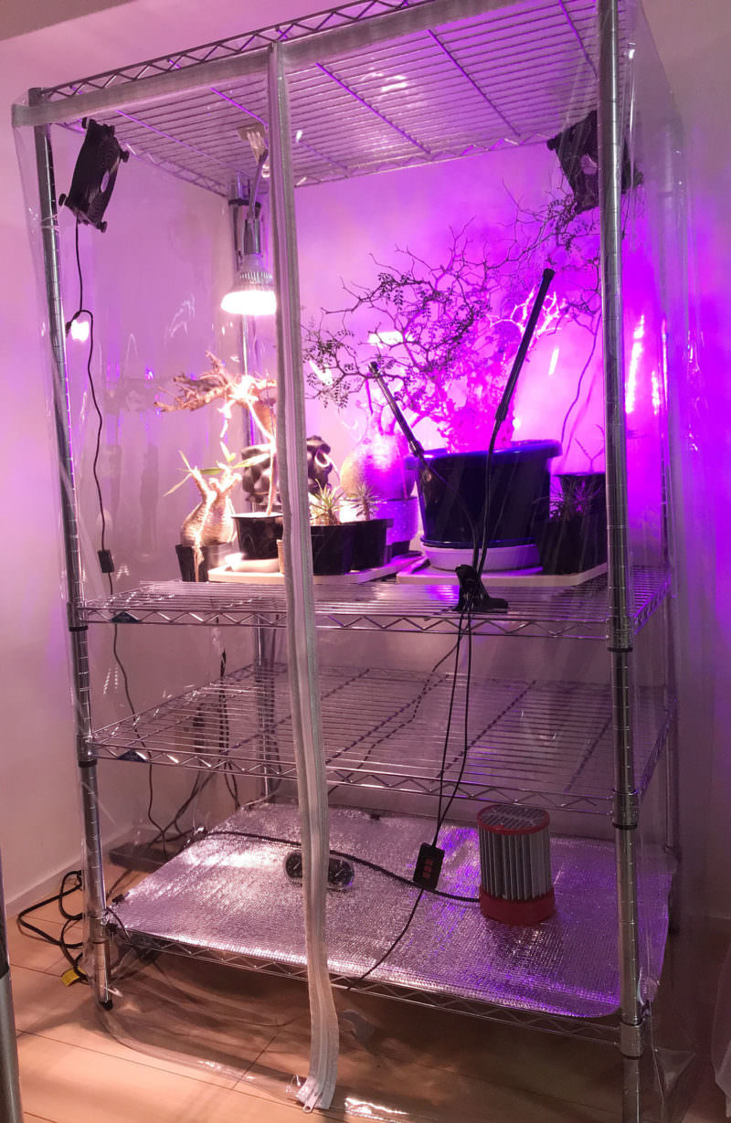 さてコーデックスの冬支度を整え中です。前回、安上がりに「室内温室」をこしらえたのですが⇣CODEXGREEN -コーデックス/塊根植物、多肉植物の育成日記【室内温室DIY ver.1】簡易室内温室をつくるの巻室内温室づくりに最低限必要なアイテムを揃え、商品レビューを交えながら温室制作を振り返ります。床に直置きのため、通気性が悪い、と。水やり後はビニールに結露がビッシリ。 パネルヒーターがなければもっと カビの温床 になったと思われます。 CODEXGREEN -コーデックス/塊根植物、多肉植物の育成日記【悲報】続・ブルセラ・ファガロイデス種子から育成チャレンジ前回、ブルセラ・ファガロイデスの種子を蒔いたものの早々に全滅。再度、ブルセラの種子を購入し実生からの育成にチャレンジします。 使い勝手。見た目。保温性。通気性。静音性(主に風音)。拡張性。 すべてを兼ね備えた、ただ一つの温室環境(-ω☆)キラリダイソン風wに大げさに言ってみましたが、最低5年 は使うことを考えればどの要素も軽視はできません。さて今回は新たに温室を見直しビルドアップをしました。目次1 【新導入】ルミナスのワイヤーラック(メタルラック)1.1 高級感のあるデザイン1.2 通気性抜群のワイヤーラック1.3 組み立てカンタン構造1.4 2.5cm刻みの可動棚1.5 拡張オプションが豊富1.6 総評2 【新導入】ビニールカバー(オーダーメイド)2.1 1cm単位のカスタム仕上げ2.2 開閉形式は2パターン選択可能2.3 ビニール素材は3パターンから選択可2.4 総評3 【新導入】換気ファン4 完成4.1 現在の温室環境5 まとめ5.1 Related Posts▼室内温室 ver.2 概要【新導入】ワイヤーラック【新導入】ビニールカバー(オーダーメイド)【新導入】換気ファン植物育成LEDパネルヒーター足元ヒーターアルミシート【新導入】ルミナスのワイヤーラック(メタルラック)【セット買い】 ルミナス メタルラック スリムシリーズ 4段 耐荷重135kg ポール径25mm 防サビ加工 幅91.5×…31,048円(11/16 17:42時点)Amazon楽天市場YahooAmazonの情報を掲載しています名称ルミナス メタルラック スリムシリーズ 4段本体サイズH156.5cm W91.5cm D61cm製品仕様風の循環効率を上げるには、ワイヤーラック(メタルラック)が最適という結論に至りました。高級感のあるデザインパーツ接合部に刻まれたブランド名がオシャレです。類似品のメタルラックと比べたわけではありませんが、塗りや溶接など仕立ては丁寧だと思います。通気性抜群のワイヤーラックスチール製のワイヤーラックですので、防火性 や 通気性 も高いです。 風の循環効率も格段に良いです。 最下段棚だけは床からの冷気対策のため、アルミシートを張りました。100均で購入。組み立てカンタン構造組み立ては女性でもできます、と謳っているだけあってホントに簡単でした。基本的には、4本の支柱の上から棚を挿し込んでいくだけで完成。ただし組み立て後から棚位置を調整するとなると面倒なことになりますので、しっかりと数センチ単位で配置決めをしてから作業に取り掛かると良いでしょう。(オレは業者かw) 足の長さは微調整ができますので、床の高低差にも柔軟に対応できます。2.5cm刻みの可動棚4段棚でワイヤー式。棚は2.5cm刻みで可動できます。棚固定具は支柱を挟み込むように組み合わせるだけでOK。最初大丈夫かこれ?と思いましたが思いのほか強度がありました。棚がずり落ちることなくしっかりと支えてくれています。今回購入のラックは奥行が62cmもありますので、その分値が張りました(汗)(一般標準の奥行きは46cm)拡張オプションが豊富ルミナスシリーズは、キャスターや追加棚、アクセサリーなどオプション豊富で拡張性も高いです。特にハーフ棚は上手にやればスペース活用ができそうな感じ。総評 4.2点奥行が46cmのモノであればもっとお手頃価格で手に入りそうです。ゆるぷおすすめの錆びないベランダ用ガーデニングラック(棚)の選び方マンションや都会のスペースが少ない場所でガーデニングをする人は、日照や場所に制限がある場合が多く、植物を置くた…【新導入】ビニールカバー(オーダーメイド)ビニールカバー ラックシリーズ センター開閉型〈TT31透明0.3mm厚〉/幅95×奥行65×高さ121〜150cm(高さは1cm…12,650円(11/16 17:42時点)楽天市場名称ビニールカバー ラックシリーズ センター開閉型本体サイズW95cmまで D65cmまで H121~150cmまで商品仕様関西の某ネットショップよりオーダー注文しました。1cm単位のカスタム仕上げ1cm単位でカスタム注文 ができます。楽天ショップからのオーダーフォームでラクラク注文可能。※サイズによって値段も変わりますビニールカバー ラックシリーズ センター開閉型〈TT31透明0.3mm厚〉/幅124×奥行50×高さ121〜150cm(高さは1c…13,090円(11/16 17:42時点)楽天市場 高さもちょうど地面に着くくらいに仕上がってきました。想定通りです(^o^)開閉形式は2パターン選択可能開閉用のファスナー形式も、「正面式開閉(マジックテープあり)」又は「サイド式開閉」から選択可能。今回は「正面ファスナー&マジ