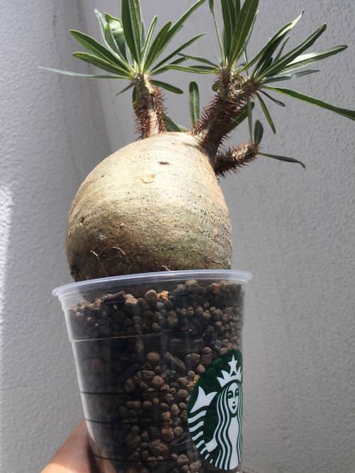 さて、始まりました(~_~) 全く予定もしていなかった連載日記。 題して、 「根腐れグラキリスの再発根チャレンジ」 先日の投稿でお伝えしました通り、パキポディウム・グラキリスを根腐れさせてしまい、ただ今瀕死の状態に陥っています。 CODEXGREEN -コーデックス/塊根植物、多肉植物の育成日記【悲報】パキポディウム ・グラキリスの根腐れが判明。原因は・・・パキポディウムの育成には「水捌けの良い」土壌が必須です。今回根腐れをしてはじめて痛感いたしました。 本連載投稿は、パキポディウム ・グラキリスを再発根させるため、園芸素人が悪戦苦闘する備忘録となります。 少しでも皆さまのご参考になれば幸いです。グラキも報われます。(って自分が悪いんだが) それでは始まり始まり〜(ちょっとヤケクソ気味) BIO SOILを利用 まずは1日ほったらかして乾かした後、水捌けの良い土壌に植付けることにしました。 土に関しては、以前から気になっていた、この土↓ 金沢バイオの土。 九州大学土壌微生物学研究室が作った、BIO SOIL「土の薬膳」。 竹すみがふんだんに入っているのが特徴的。 ◆商品カタログ ◆商品タグの写真 kanazawa-bioホーム | kanazawa-bio 透明カップを使う スタバの透明カップを利用し、将来の発根確認に備えることにしました。 実はこのカップのサイズ感(トールサイズ)、元々利用していた黒蘭鉢4号(内径12cm)にスッポリ収まることを確認済み。 蘭鉢上部と透明カップ上部までの間は約2cmくらい。 根に光が直射するのは良くないと聞いていたので、育成中は蘭鉢で覆ってしまえば問題はない。 それにしても発根確認グッズってマニアの需要はあると思うんだが誰か作らんのかなぁ 透明カップの底に穴を開ける カップの底にキリで複数の穴を開け、ドライバーを突っ込んでさらに穴を大きくする。 土をフルイにかける 鉢底石を入れ、5mm網のフルイにかけた金沢バイオの土を投入。 根腐れにはホトホト懲りたので、なるべく粉粒を取り除くようにした。 植付け グラキリスの根元が真下にくるようにセット。 上部の隙間から土を入れ 安定性を度る。 蘭鉢に透明カップを落とし込む 最後に透明カップとグラキを麻紐で固定させ、 黒蘭鉢にカップを落としんで完成。 完成形がこちら↓ 結構な角度で傾けてもずり落ちることはない。 まとめ まだまだ予断を許さない状態ですが、あとできることといえば、 ひたすらほったらかすことだけw 今回の根腐れの一件で学んだこと。 追伸、 果たしてこの連載どこまで続くのか!? 次の投稿が悲報でないことを切に願いつつ・・・ 洋蘭プラ鉢 5号 10個 黒ラン鉢 プラ鉢 15cm 薔薇 苗 深鉢 キンリョウヘン 金稜辺 植木鉢 鉢 バラ ばら…1,450円(11/17 11:11時点)Amazon楽天市場YahooAmazonの情報を掲載しています 【多肉植物/種子】 Pachypodium Gracilius★パキポディウム・グラキリウス(グラキリス) 種“象牙宮”◆5粒♪ […2,980円(11/17 04:33時点)Amazon楽天市場YahooAmazonの情報を掲載しています Related Posts【検証〜結果】ゲッソリ凹んだ現地球パキポディウム・グラキリスの復活を試みる胴体が萎んでしまったパキポディウム・グラキリスの蘇生を試みた…【〜60日】根腐れパキポディウム・グラキリス再発根チャレンジ④根腐れパキポディウム・グラキリスの再発根チャレンジ60日目と…【〜40日】根腐れパキポディウム・グラキリス再発根チャレンジ③根腐れパキポディウム・グラキリスの再発根チャレンジ40日目と…【〜30日】根腐れパキポディウム・グラキリス再発根チャレンジ②根腐れパキポディウム・グラキリスの再発根チャレンジ30日目と…【悲報】パキポディウム ・グラキリスの根腐れが判明。原因は・・・パキポディウムの育成には「水捌けの良い」土壌が必須です。今回… 記事が良かったら ↓ ポチッと