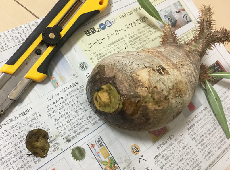 過去の記事はこちら↓ https://codexgreen.com/gracilius-rootings_40/目次1 〜50日目1.1 カッティング1.2 白旗宣言2 60日目3 まとめ3.1 Related Posts〜50日目水耕をはじめてから約2週間。特に元気になった様子もない。相変わらず、芋は少し柔らかい。(要所で固いところもある)どうも根元の切り口の色が良くない気がしたので、恐る恐る鼻を近づけて嗅いでみる。!!「No!腐ってやがる!」↑腐食した根元部分。(結構グロくてすいません^^;)腐敗臭がすごいんじゃぁ、、、またかよ・・カッティング応急救護としても一回、根元を切ってみようと。4、5mmはいっちゃおうかと。 いざ!!7割くらいは根腐れが進んでいる感じ。白旗宣言もはやこれまでか。正直、真っ二つに一刀両断する勇気はない。あとはほんのわずかな希望を抱きつつ、ヒーターの上でひたすら温め続けようと思う。60日目乾いた根元断面の様子↓この断面を見て、とあるinstaの投稿を思い出しました。 この投稿をInstagramで見る ケンジ(@land110_exoticplants)がシェアした投稿(投稿画像の2枚目参照)もしかしたらこの芋も一度根腐れがあるのかもしれません。まとめ↑定位置に戻ったグラキリス わずかな遅れが命取りになる。今回身をもって経験したことを次に活かしていくしかない。141.パキポディウムの中で一番人気!パキポ・グラキリス。この独特のボトル型の幹がたまりませんね。 (pac…Amazon楽天市場YahooAmazonの情報を掲載していますRelated Posts【検証〜結果】ゲッソリ凹んだ現地球パキポディウム・グラキリスの復活を試みる胴体が萎んでしまったパキポディウム・グラキリスの蘇生を試みた…【〜40日】根腐れパキポディウム・グラキリス再発根チャレンジ③根腐れパキポディウム・グラキリスの再発根チャレンジ40日目と…【〜30日】根腐れパキポディウム・グラキリス再発根チャレンジ②根腐れパキポディウム・グラキリスの再発根チャレンジ30日目と…【新連載】根腐れパキポディウム・グラキリスの再発根チャレンジ①根腐れパキポディウム・グラキリスの再発根チャレンジ1日目とな…【悲報】パキポディウム ・グラキリスの根腐れが判明。原因は・・・パキポディウムの育成には「水捌けの良い」土壌が必須です。今回… 記事が良かったら ↓ ポチッと