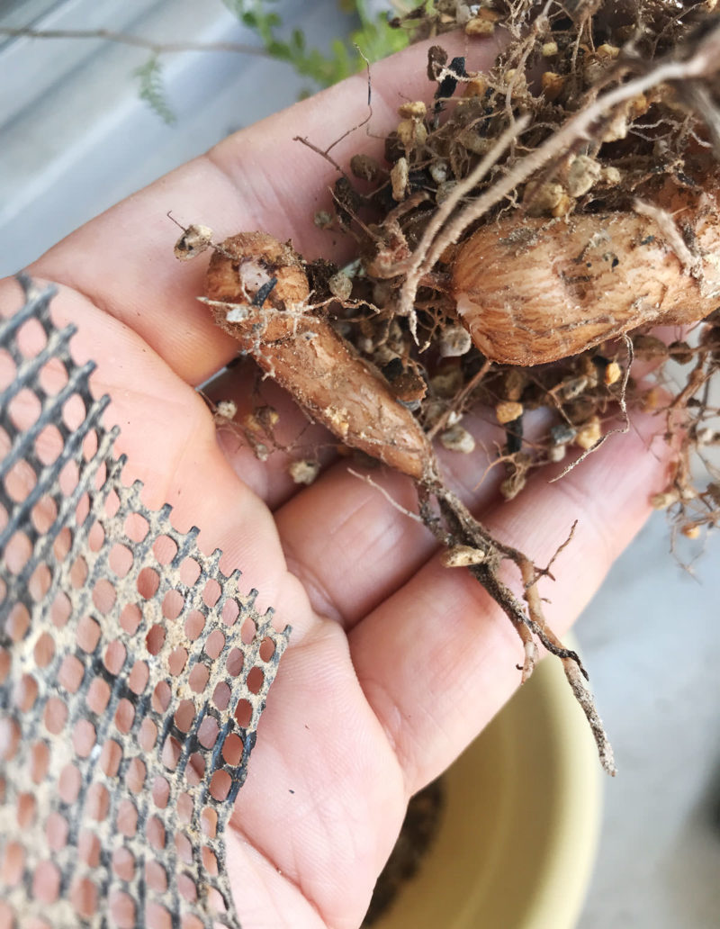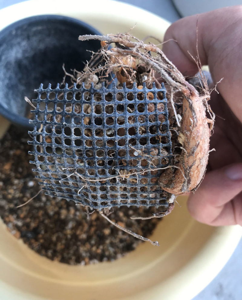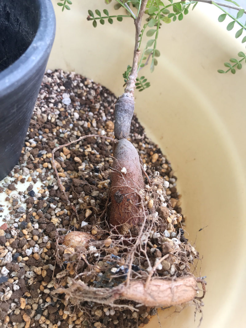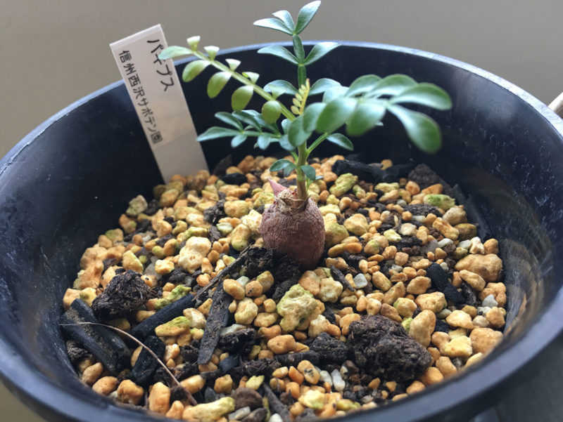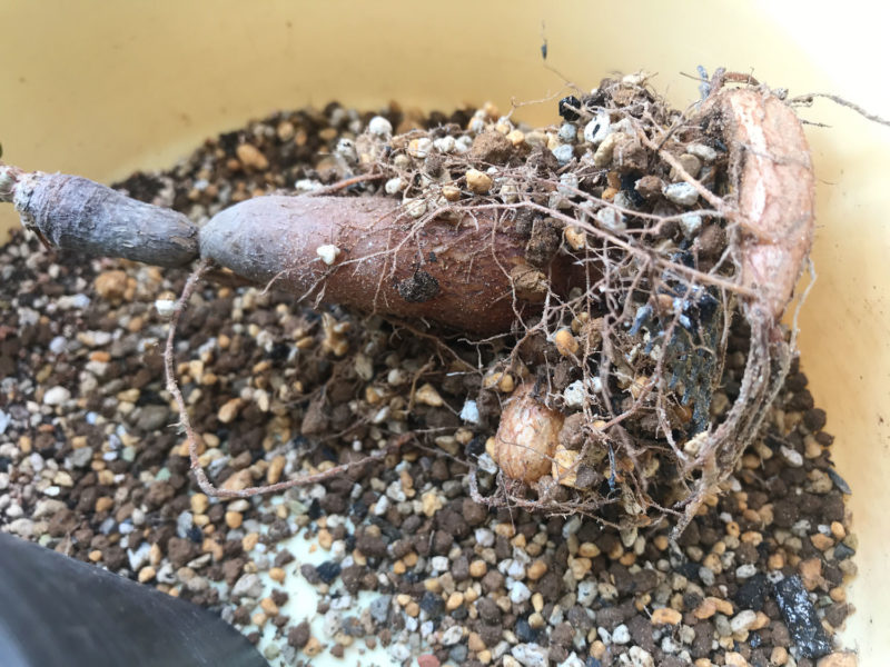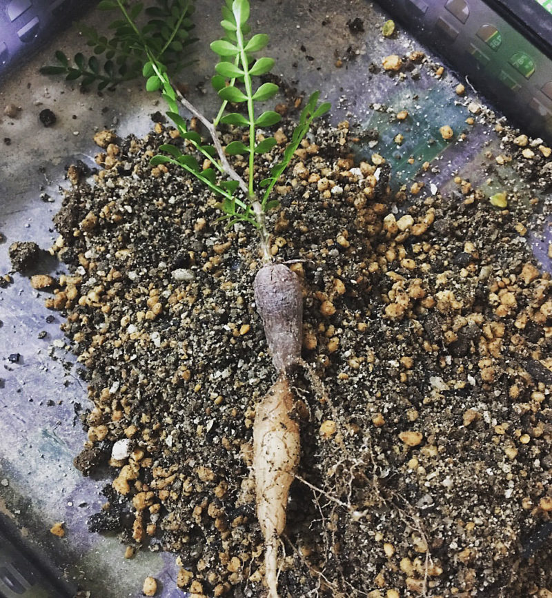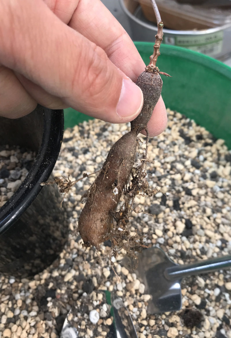 目次1 発育状況1.1 購入当時1.2 3ヶ月目1.3 半年後1.4 1年後2 植え替え/鉢増し作業3 まとめ3.1 Related Posts発育状況昨年初夏に信州西澤サボテン園さんより購入したオペルクリカリア・パキプス現地実生苗(輸入)の経過報告を致します。www.nishizawacactus.jp信州西沢サボテン園信州西沢サボテン園は サボテン・多肉植物・蘇鉄類の生産 販売専門店です。 信州西沢サボテン園では、サボテン・多肉植物・蘇鉄類を中心に、実生から輸入品まで幅広く取り扱っております。日本全国へ通信販売承ります(店頭でも販売しております)購入当時CODEXGREEN -コーデックス/塊根植物、多肉植物の育成日記オペルクリカリア・パキプスの輸入苗をオンラインで購入オペルクリカリア・パキプスの輸入株をオンラインストアで購入し、到着から開封までをレビューいたしました。3ヶ月目半年後1年後そしてこの度、育成を始めてから早1年と1ヶ月。半年ぶりの植え替え・鉢増しを機に、地中内部を確認してみます。植え替え/鉢増し作業ここのところ(2019年5〜6月)は、冷夏の影響で季節外れの紅葉が続いたり、イモムシに葉を喰われたり(苦笑)と、パキプス君にとっては散々な日々でした。 そんなこんなで、あまり期待せず、サクッと済ませようと思ったところが、 おぉぉ〜(;O;)思いのほか、パワータンクめちゃ出来とる!!これぞオペルクリカリアの真骨頂。地上の芋自体はあまり成長していませんが地中の動きは想像以上に早い。よく見ると、鉢底網を噛み込むほどにタンクが成長している。無理に網を引っ張るも、 あ、切れた(・・;)辛うじて細根で繋がっているようでしたので今回は根挿しはせず、現状維持に。一応、傷口にはルートン塗ってからケアヘルスで処置。日本曹達 殺菌剤 トップジンMペースト 200g716円(11/17 10:07時点)Amazon楽天市場YahooAmazonの情報を掲載しています石原バイオサイエンス 植物調整剤 ルートン 20g238円(11/16 20:25時点)Amazon楽天市場YahooAmazonの情報を掲載しています用土に関しては、ベアルートのパキプスよりも粒を小さくし、保湿性を高めて います。 主用土は引き続き、”刀川平和農園のサボテン培養土(極小粒相当)”平和 サボテン・多肉植物の培養土 10リットル1,043円(11/17 00:43時点)Amazon楽天市場YahooAmazonの情報を掲載していますさらに ”おまじない” がてら、・くんたん(酸度調整)・バーミキュライト(保湿、発根促進)・ミリオンa(土壌改良、浄化)を少量混入させてます。平和 くん炭(DIYシリーズ) 2リットルAmazon楽天市場YahooAmazonの情報を掲載しています瀬戸ヶ原花苑 バーミキュライト 3L313円(11/17 00:18時点)Amazon楽天市場YahooAmazonの情報を掲載していますソフトシリカ ミリオンA 500g4,980円(11/16 22:06時点)Amazon楽天市場YahooAmazonの情報を掲載しています次なる鉢は、これからの成長も考慮し、縦長のらん鉢 へインストールしていきます。完成⇣洋蘭プラ鉢 4号 10個 黒ラン鉢 プラ鉢 12cm 薔薇 苗 深鉢 キンリョウヘン 金稜辺 植木鉢 鉢 バラ ばら…1,030円(11/17 10:07時点)Amazon楽天市場YahooAmazonの情報を掲載していますまとめさらに1年後、どんな姿をみせてくれるのか(^^)これからの成長が楽しみです。【種子】オペルクリカリア・パキプス[MG02]実つき 10s Operculicarya pachypus2,325円(11/17 02:40時点)Amazon楽天市場YahooAmazonの情報を掲載しています Related Posts【〜300日目】オペルクリカリア・パキプス現地株の植え替えオペルクリカリア・パキプス現地球の発根管理を始めて300日目…オペルクリカリア・パキプスの輸入苗をオンラインで購入オペルクリカリア・パキプスの輸入株をオンラインストアで購入し… 記事が良かったら ↓ ポチッと
