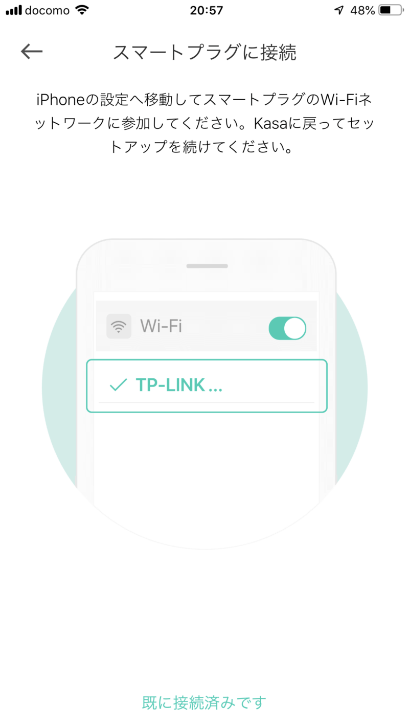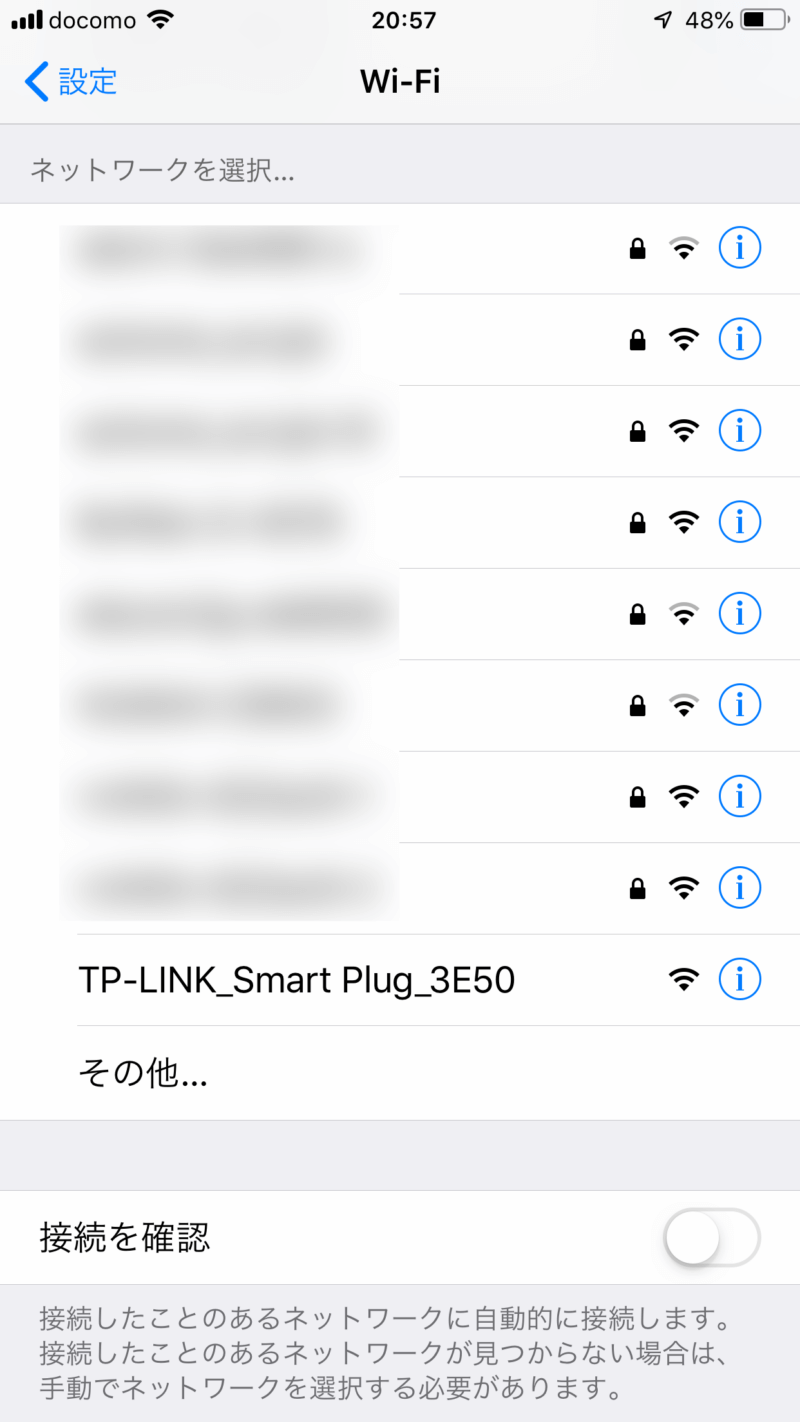 「TP-link 〇〇〇〇」が出現しているので接続します。