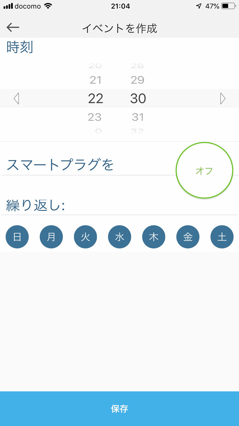 ①時刻、②オン/オフ、③繰り返し を設定して保存するだけ。