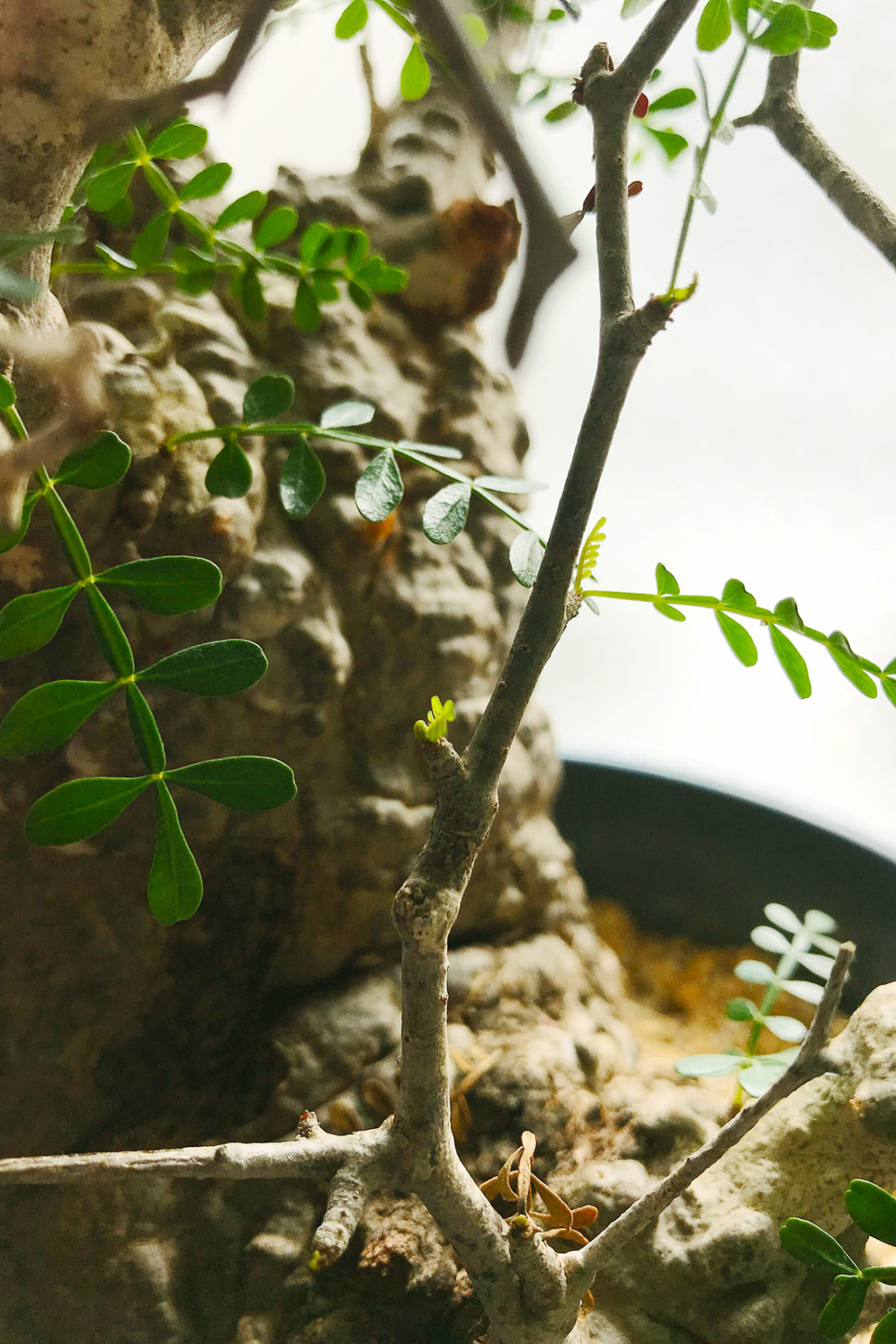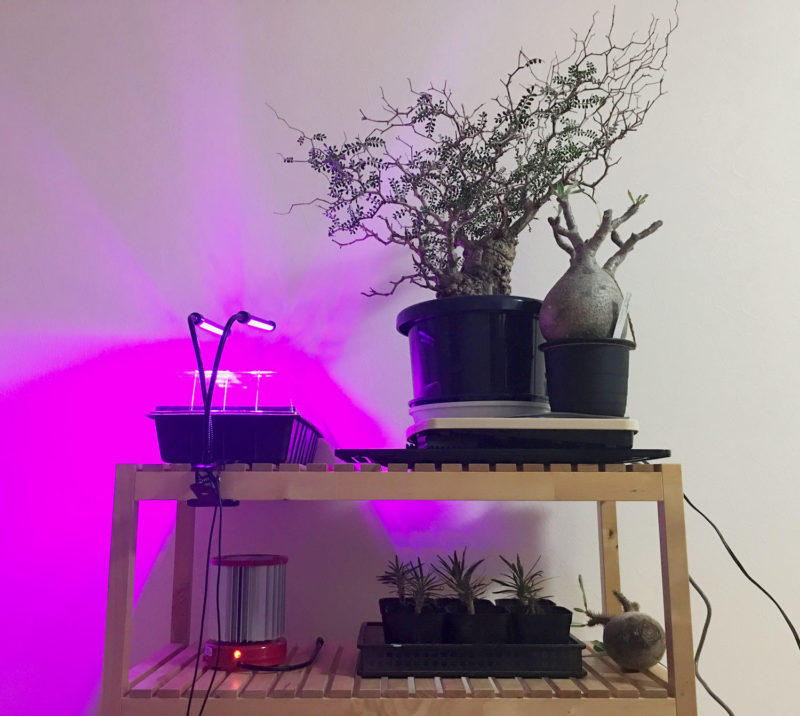 オペルクリカリア・パキプス現地球の発根管理を始めて180日目となります。目次1 〜90日目2 〜120日目2.1 小虫を駆除3 〜180日4 パキプス発根管理における”三箇条”4.1 【その1】鉢内の用土に至るまでしっかりと温める4.2 【その2】排水性、通気性の高い配合土にする4.3 【その3】光を存分に浴びさせる5 まとめ5.1 Related Posts〜90日目季節は10月下旬。室内の窓辺での管理が増えました。気温24度前後湿度60%前後室内環境気温の低下とともに、一時の芽吹きラッシュも落ち着いた様子。とはいえ、足元ヒーターのおかげか葉っぱが萎れる気配はありません。相変わらず元気な様子。ぐんぐんと伸び続ける新枝⇣そういえば鉢底から覗いていた発根が今では確認できません。◆育成一ヶ月目の鉢底(少しだけ根が出ている)根も”音を上げる”ほど熱いのか、、、鉢底付近の温度は 38〜40度 くらいはあります。おそらく鉢内を這うようにして横へと逃げていった(方向転換した)ように思われます。まぁ元気なんでスルーしてます。〜120日目11月下旬。室内温室へ移動しました ⇣温度30度前後(パネルヒーター有)湿度70%前後育成環境CODEXGREEN -コーデックス/塊根植物、多肉植物の育成日記【室内温室DIY ver.1】簡易室内温室をつくるの巻室内温室づくりに最低限必要なアイテムを揃え、商品レビューを交えながら温室制作を振り返ります。小虫を駆除育成当初から塊根部を這い回っていた”小さな虫”が、3、4匹くらいにまで増えた気がしましたので駆除を実施しました。◆使用した駆除剤「キング園芸 マシン油乳剤」キング園芸 マシン油乳剤 500ml614円(11/16 23:46時点)Amazon楽天市場YahooAmazonの情報を掲載しています乳剤を適量薄めて塊根部を集中的にスプレー噴霧(一回目)。 翌日。また一匹発見。(2枚目に動画あり) この投稿をInstagramで見る mofmof7(@mofmof7)がシェアした投稿一週間置いてから再噴霧(二回目)。それから一か月経ちますが、虫は見当たりません。果たして彼らは害虫なのか否か。。。。定かではありません。合掌乳剤を混ぜた後はすぐに使い切ること。毒性が増します。◆「殺虫剤の失敗談」参考リンクCODEXGREEN -コーデックス/塊根植物、多肉植物の育成日記【悲報】殺虫剤の調合液の持ち越し使用は、ダメ絶対!!カイガラムシやハダニ、アブラムシなどを駆除する殺虫剤は、使用方法をしっかりと確認してから散布しましょう。明らかな”枯れ枝”も剪定もしました。〜180日ワイヤーラック温室へアップデートし、新たなコーデックスもお迎え。CODEXGREEN -コーデックス/塊根植物、多肉植物の育成日記【室内温室DIY ver.2】「ワイヤーラック」温室へビルドアップするの巻室内温室を「ワイヤーラック」温室へとビルドアップしました。実際に購入した温室器具の使用感をレビューしています。当初、温室内の温度を、常時30〜32度になるようキープしていました。しかし一部のベアルート株が根腐れを起こす など、土壌の湿気をうまく揮発できていないようでした。(※用土の配合、鉢の素材構造も要因)取り急ぎサーモスタットを調整し直し、常時 33〜34度 へと室温を上げました。パネルヒーターのサーモスタットの調整温度は40度を超えるメモリに合わせています。結果的にパキプス(大)は、新芽ラッシュの予感。新枝も段々と太くなり始めました⇣温度33〜34度湿度50%前後(水やり後60%)水やり頻度少量を2、3日置き。液肥・活力剤を極薄。適宜、霧吹き。育成環境 冬越しの準備はこれでほぼ完了です。パキプス発根管理における”三箇条”育成を始めて半年が経過しました。パキプスの発根管理を振り返って、大事な勘所「三箇条」を以下、覚書き致します。※あくまで個人的主観ですのでご参考までに【その1】鉢内の用土に至るまでしっかりと温めるなるべく熱伝導の良い鉢(プラスチック製や素焼き製等)を選択し、パネルヒーターなどを駆使して温めることがとても大事。鉢の表面を触ってほんのり温かいくらいでは心許ない。個体差はあると思いますが、多少熱すぎるくらいで丁度いいかも。鉢の大きさも考慮すべきです。大きすぎては温まりづらく、小さすぎては根の成長を阻害します。◆「鉢の大きさと熱伝導」イラスト参考しっかりと熱が伝わるように大きすぎない鉢で・・・【その2】排水性、通気性の高い配合土にするベアルート株は本当に根腐れしやすい。(実生株は割と強い)水やり後すぐに表面が乾くくらいの用土で丁度よい。マジで。水をあげ過ぎないことにも通じます。(水耕は例外)慣れないうちは市販の配合済み専用土を利用したほうが手堅い。オススメは、「ゴールデン粒状培養土(サボテン・多肉植物用)」「ベストソイルミックス」等BANKS Collection Best Soil Mix/ベストソイルミックス 3リットル (1)2,046円(11/17 07:17時点)Amazon楽天市場YahooAmazonの情報を掲載しています 天気を気にするひとのブロッグ用土を考える日。 - 天気を気にするひとのブロッグ☔︎/19℃ めちゃ寒…植物取り込むべきでした どれが一番なのか 今年は色々な用土を買い