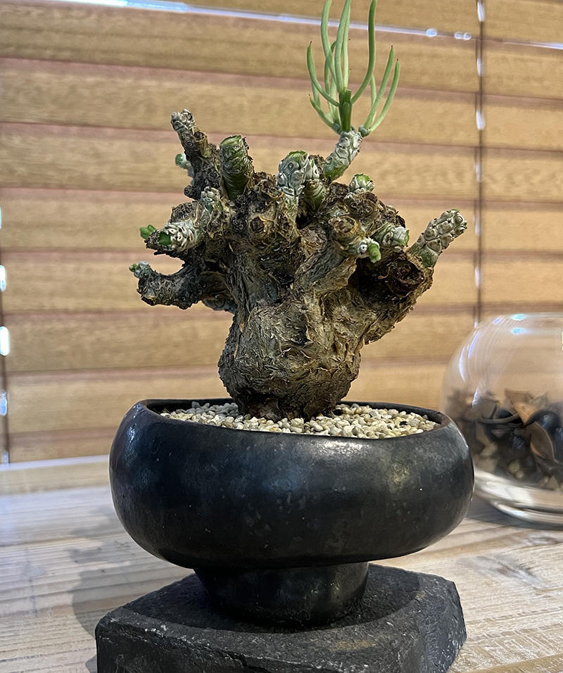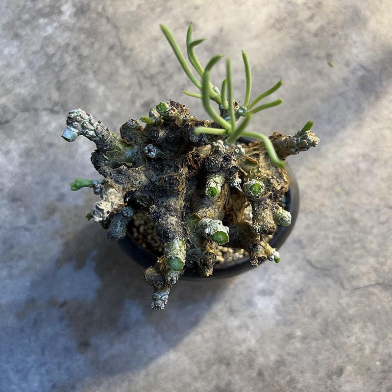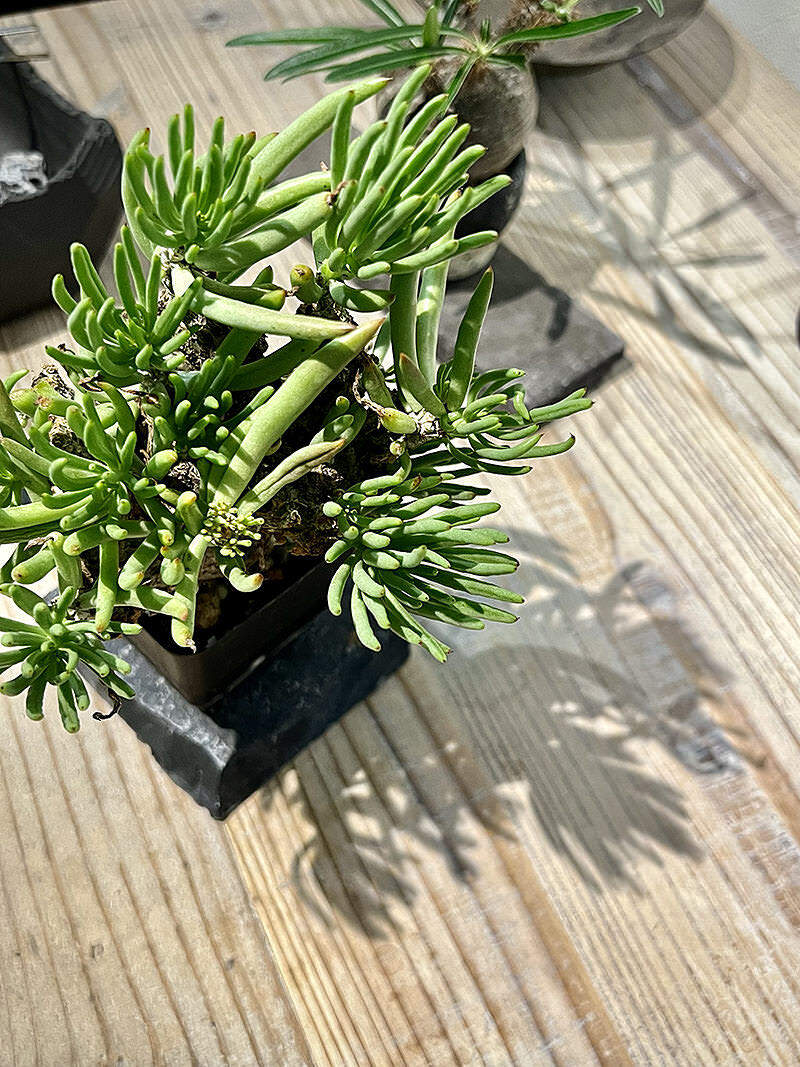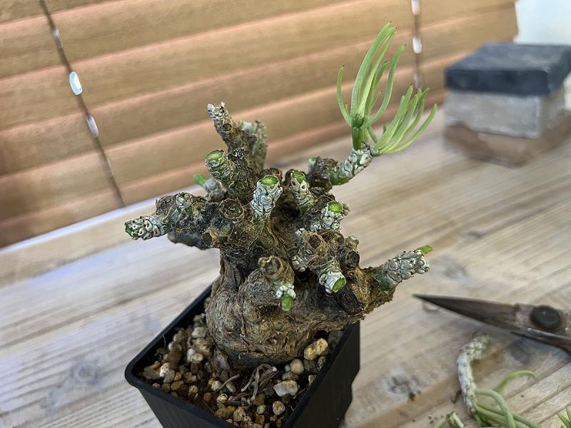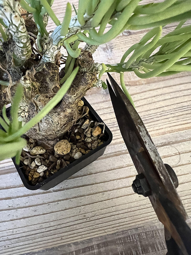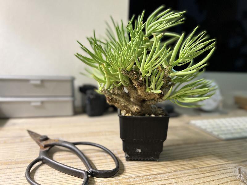目次1 200〜300日目2 350日目〜2.1 整形、剪定2.2 根周りの整理2.3 植え付け3 T.ペアルソニーの活動期4 まとめ4.1 Related Posts200〜300日目季節は夏の終り。次々と新葉が展開。パワー全開の様子。秋〜冬。そろそろ繁らないようにセーブしてほしいところですが、、、初冬の頃。さすがに伸びすぎたので、枝をカットして微整形。350日目〜冬場10度以下になった頃から、少し調子を崩したように見受けられたので、急ぎ屋内温室管理に切り替え。その後は温室内で調子を取り戻したものの、葉のぷっくり感がなく、枝も徒長気味で伸び放題。全体的にだらしないフォルムになっていました。この際、整形ついでに土替え&鉢替えをまとめて実施いたします。整形、剪定剪定前にハサミを消毒。最近は病院風に消毒液にも浸してます。使用後に放り込んでおけばいいので楽ですね。ビストロン-10 第三りん酸ナトリウム水 10%液 1L 鋏 刃物のウイルス消毒剤1,800円(11/17 04:06時点)Amazon楽天市場YahooAmazonの情報を掲載しています枝の根元からバッサバッサ切り落としていく。あまりにさみしいからバカ殿風にひとつだけ残すことにしました( ^ _ ^ ;221 岡恒 植木鋏D型 箱入3,913円(11/17 04:06時点)Amazon楽天市場YahooAmazonの情報を掲載しています根周りの整理株を支えながらゆっくり土をこぼしていく。根細いなぁ〜これ念入りに根周り整理するとブチブチいきそうなんで、付着した土は残しておきます。植え付け根の感じからすると、縦方向に一気に伸長はしないと判断し、“浅鉢”に植え込んでいくことにします。(余談ですが、ペラルゴニウムとかは底根が早い印象)用土は、排水性を考慮した極小粒ベースのリサイクル土。[イワモト] 登録商標「三本線」焼成硬質赤玉土 14L (極小粒)1,350円(11/17 04:06時点)Amazon楽天市場YahooAmazonの情報を掲載しています園芸始めて3〜4年目ですが、少しづつ納得がいくような土作りができるようになってきました。何度も土を手で触りながら配合を調整する作業は実に面白い。日々勉強です。ベスポジを探る↓最後に軽石で化粧して完成。T.ペアルソニーの活動期初夏頃のペアルソニーチレコドンは冬型扱いになってはいますが、20〜25度前後の 初夏・初秋 の季節が最も好調な印象です。ただいまの季節は冬、陶器鉢も冷えやすいので一時は温室内で管理いたします。昭和精機工業 パネルヒーター 250W(グリーンサーモZY-6A付) (SPZ-250)Amazon楽天市場YahooAmazonの情報を掲載していますまとめ土いじり楽し〜(^o^) 最近ベランダ広いところに引っ越したので、さらに植沼の深みにハマっていきそうです。( ´ー`)y-~~ またまた面白そうな図鑑が、、NHK出版 決定版 多肉植物図鑑2,750円(11/17 04:06時点)Amazon楽天市場YahooAmazonの情報を掲載していますRelated Posts【75日目】チレコドン・ペアルソニー Tylecodon pearsonii 現地株の発根管理チレコドン・ペアルソニー現地株の発根管理を始めて75日目とな…【45日目】チレコドン・ペアルソニー Tylecodon pearsonii 現地株の発根管理チレコドン・ペアルソニー現地株の発根管理を始めて45日目とな…【5日目】チレコドン・ペアルソニー Tylecodon pearsonii 現地株の発根管理チレコドン・ペアルソニー現地株の発根管理を始めて5日目となり…チレコドン・ペアルソニー Tylecodon pearsonii 発根管理《下処理〜植え込み編》チレコドン・ペアルソニーの現地株の発根管理日記です。根周りの… 記事が良かったら ↓ ポチッと
