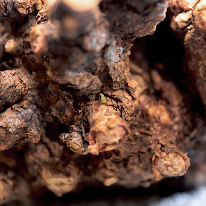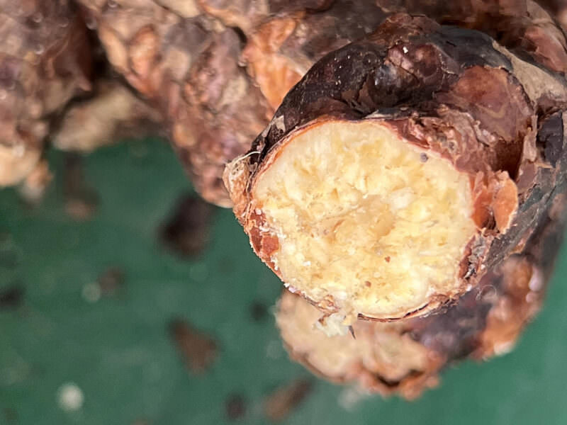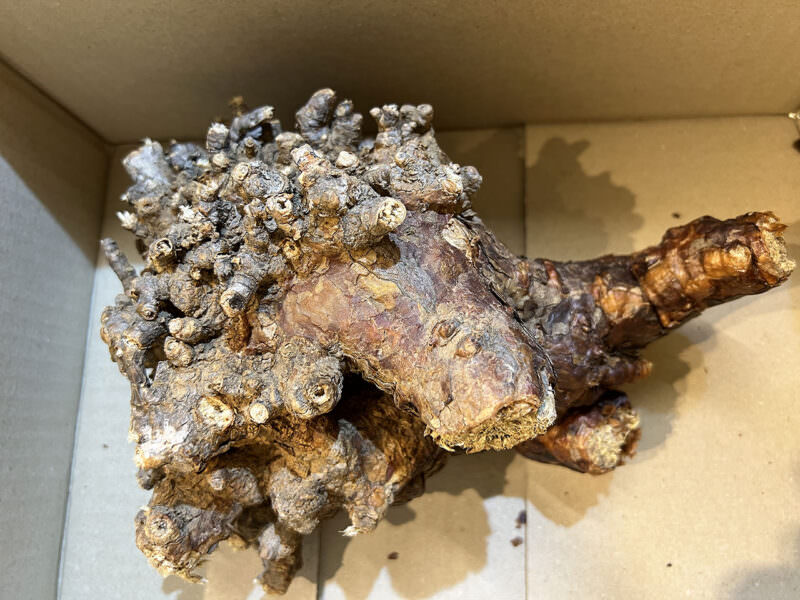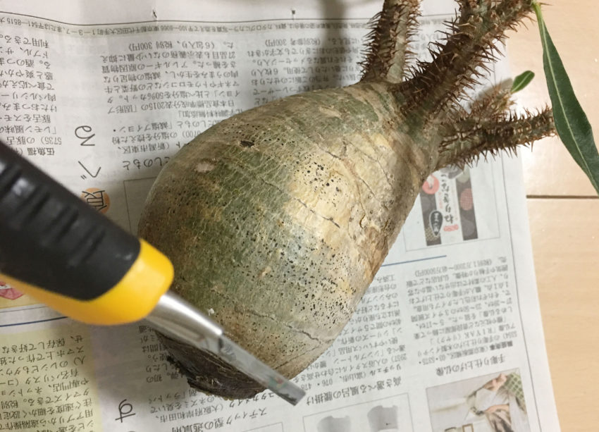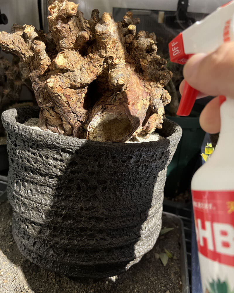 ケラリア・ピグマエア Ceraria pygmaea の大株 を迎えました。最大幹幅は15~16cm。かなりの重量◎です。これは負けられん・・・(`・ω・´)前回の投稿で記述した、ケラリア・ピグマエア未発根株の状態判断や事前処置、育成環境を、早速この大株で試してみたいと思います。目次1 状態チェック2 殺菌〜発根促進3 用土作り3.1 配合率4 植え込み5 温室内で管理育成5.1 ケラリア・ピグマエア原生地・オレンジ川近隣の町「Kaokoland」の年間気温&降水量6 【有力情報】防腐・殺菌作用もあるHB-101希釈スプレー7 まとめ7.1 Related Posts状態チェック到着後枝葉はすべて枯れているようです。枝先をカット✂すると、断面は湿り気を帯びています◎。画像中央奥側は湿気を帯びた断面指で簡単に取れる枝も多々あり。できる範囲、枝先の枯れた部分は剪定し除去しました。肝心の根っこをチェック↓枯れた根先(根冠)を指で折った場面お〜!いい根!フレッシュ!(^o^)他の根も少しカットしては状態を見る↓カット続けるうちに、きれいな断面が(^o^)これ、いけるんじゃないか!?((o(´∀`)o))ワクワクと・こ・ろが、、 喜びも束の間・・・最も太い根 をチェックする、、恐る恐るカット↓むむっ・・・(-_-メ)うわぁ、腐ってるなぁ、、(~_~;)腐食している部分は柔らかく、黒〜茶褐色 をしてます。だぁ〜マジか、、(+_+)、思ったよりも深いぞ、、、(;´∀`)仕上げは彫刻刀を使う。義春刃物 高級 付鋼製 よしはる彫刻刀 プラケース入 7本組 HP-72,200円(11/16 17:27時点)Amazon楽天市場YahooAmazonの情報を掲載しています根元のさらに奥の方まで削ったので、深く植え込む必要性が出てきました。仕立てが難しくなったぁ〜・・(*´Д`)少々残念ではありますが、生かすための処置として背に腹は代えられません。気づけただけでも結果オーライです。表皮を削って腐食チェック表皮を彫刻刀で削ったり、指で押さえるなどして他にも腐食がないかも入念にチェック↓殺菌〜発根促進殺菌剤はホーマイを使います(手元にこれしかなかった)。1〜2時間くらい株全体を浸水させました🛀。ホーマイ臭ぇ〜〜〜(>ω<)日本曹達 殺菌剤 ホーマイ水和剤 100g627円(11/16 19:53時点)Amazon楽天市場YahooAmazonの情報を掲載しています株の下半分、根元部分のみ殺菌後、発根促進剤であるオキシベロン水へ1〜2時間浸水🛀。希釈率は100倍くらい。バイエル 殺菌剤 オキシベロン液剤 500ml3,170円(11/16 17:25時点)Amazon楽天市場YahooAmazonの情報を掲載しています続いて、根の断面に粉状の発根促進剤ルートンを塗って🎨、半日くらい乾燥させました。ルートンを断面に塗る温室内で寝かせる住友化学園芸 植物成長調整剤 ルートン 15g380円(11/16 20:26時点)Amazon楽天市場YahooAmazonの情報を掲載しています墨運堂 書道筆 2本組 太筆・細筆 22719Amazon楽天市場YahooAmazonの情報を掲載していますおっ!少しだけ芽吹き箇所を発見!🌱これは期待できるぞ!😃画像中央に小さく芽吹きあり。写真以上に緑色です用土作り植え込み土はさらさらして柔らかく乾燥しやすい配合にしました↓配合率軽石 4バーミキュライト 3ゼオライト(ソフトシリカ)3肥料系(くんたん、HB101 顆粒、マグアンプK) 少量軽石砂 細粒 14L1,720円(11/16 17:27時点)Amazon楽天市場YahooAmazonの情報を掲載しています瀬戸ヶ原花苑 バーミキュライト 3L313円(11/17 00:18時点)Amazon楽天市場YahooAmazonの情報を掲載しています平和 くんたん 10リットル755円(11/16 17:16時点)Amazon楽天市場YahooAmazonの情報を掲載していますハイポネックスジャパン 肥料 マグァンプK 中粒 600g2,380円(11/17 05:23時点)Amazon楽天市場YahooAmazonの情報を掲載しています少々やり過ぎなくらいの速乾用土ですが、過去に失敗した教訓として、根腐れ予防を第一に 考えた結論です。保湿性のある用土は避け、企図してバーミキュライトと軽石で 蒸散性を高める 作戦。バーミキュライト肝は ゼオライト でしょうか。ゼオライトの吸湿性、通気性(他、保肥性や酸度調整)にはかなり期待してます。ミネラル豊富で発根促進作用もあります。市販のゼオライトの中でも、硬すぎず多孔質のミリオンA(ソフトシリカ)は使いやすくおすすめです。ソフトシリカ ミリオン 1kg2,000円(11/17 05:35時点)Amazon楽天市場YahooAmazonの情報を掲載しています植え込み植木鉢は大きめのシャロー鉢(平鉢)、、、の予定でしたが、なんとなんとコヤツ入りきれません(汗)BLACK PLASTIC POT【SHALLOW TYPE】M:25.5cm×10cm 黒 プラ鉢 浅鉢 植木鉢 ブラックポット1,399円(11/17 07:29時点)楽天市場想定よりもデカかった(^_^;)急遽、深めの陶器鉢で挑むことに。。。(なにかと勝手が変わってくるなぁ・・)鉢底には中粒相当のミリオンAを敷き詰め(湿度調整)、ミリオンAソフトシリカ ミリオンA 500g4,980円(11/16 22:06時点)Amazon楽天市場YahooAmazonの情報を掲載していますその上には硬質で粒状のくんたんを乗せる(株の沈下抑制、湿度調整)。粒状くんたん根元深くまで腐食を除去した部分がネックとなり、株の重心が定まらないので、途中に中粒〜大粒の日向石を適量挟み込んで対処しました。重心固定のため、鉢