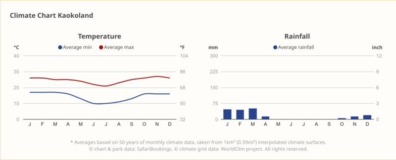 ケラリア・ピグマエア原生地・オレンジ川近隣の町「Kaokoland」の年間気温&降水量